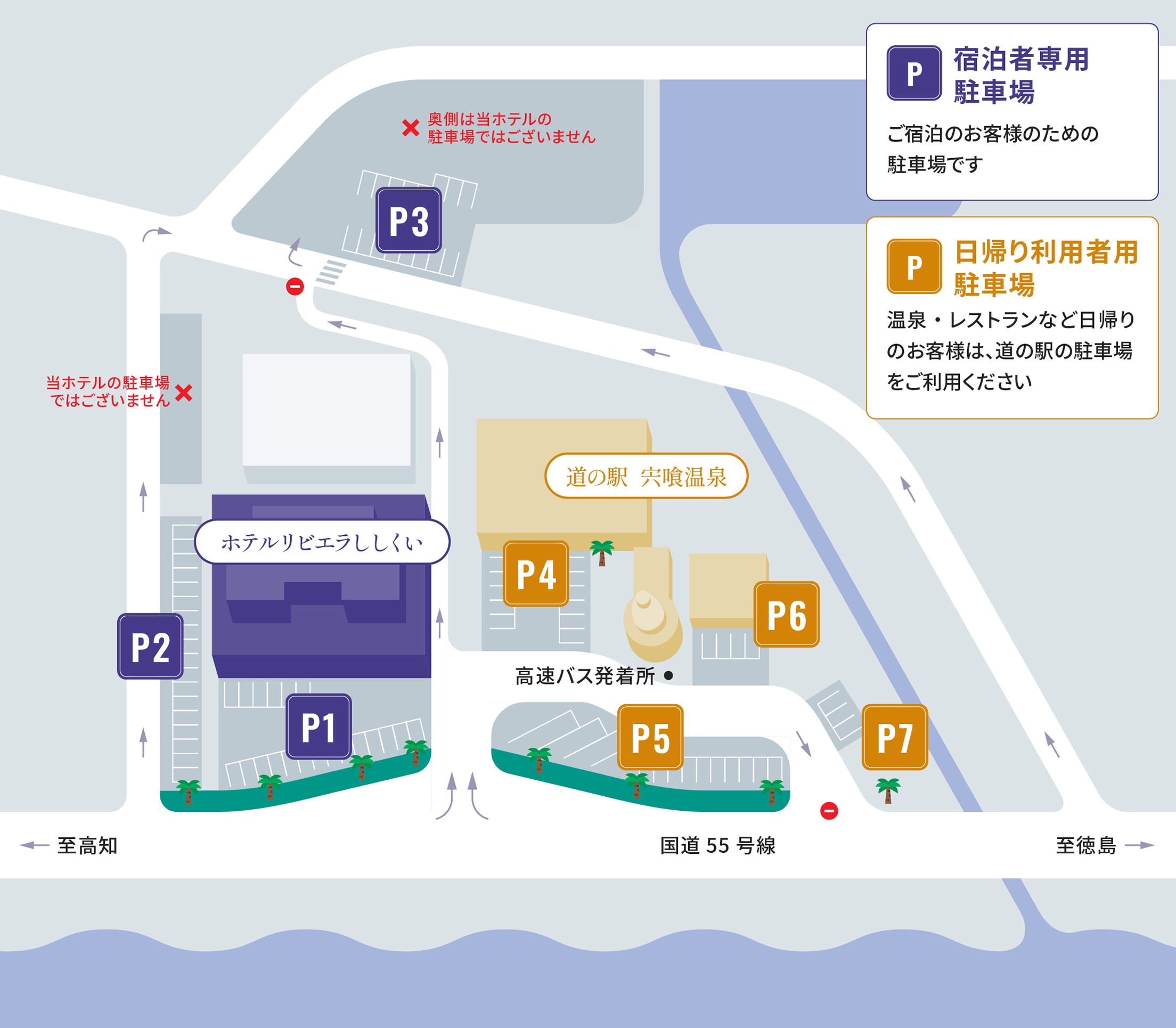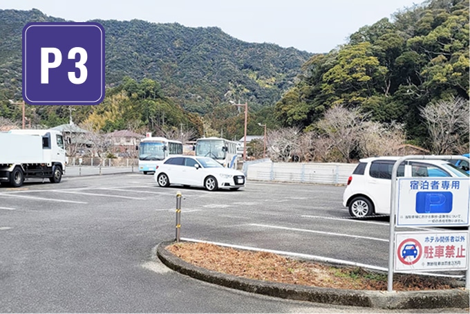 宿泊と日帰りでは、利用できる駐車場が異なります。