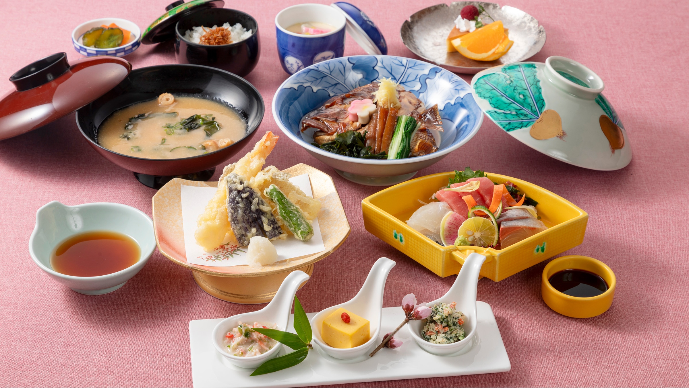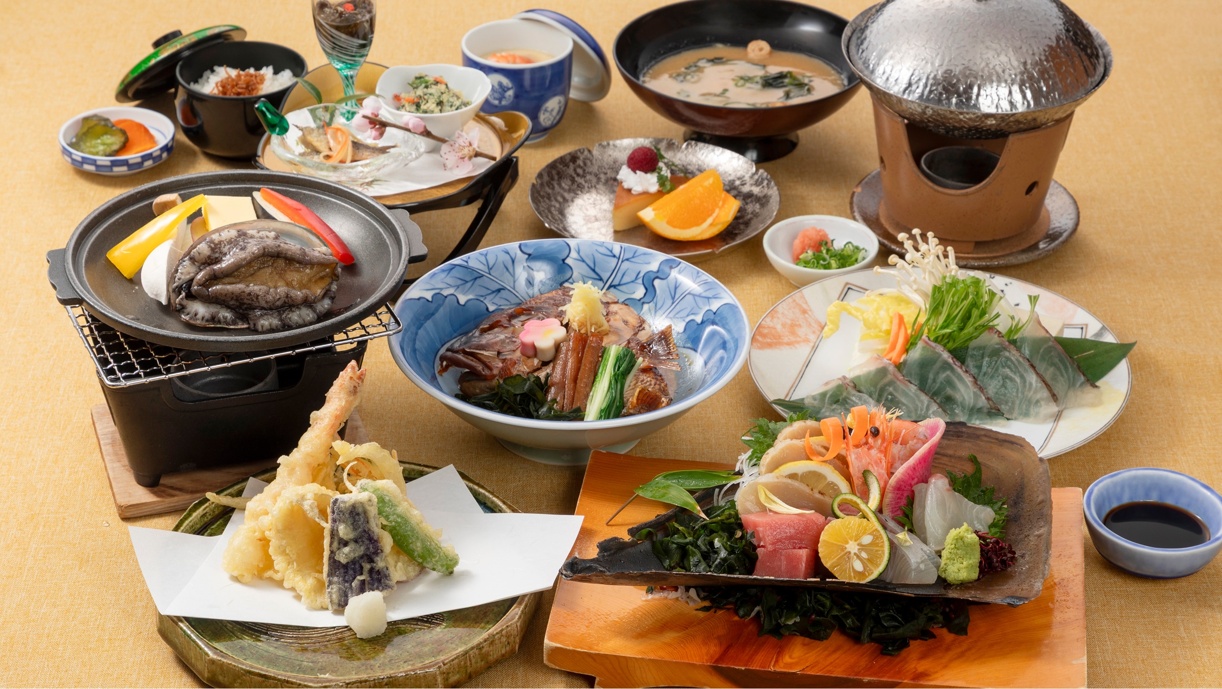 あわびなどの豪華食材をはじめ、鯛のお造りや季節の小鉢、地魚のお造り、天ぷらなど、贅沢な味わいをご堪能いただけます。